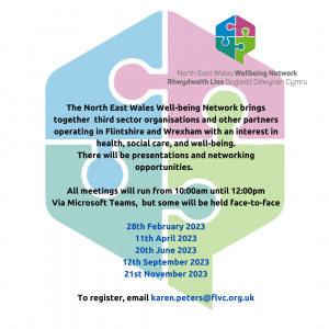 The North East Wales Wellbeing Network is hosted by the North East Wales Wellbeing Team at FLVC and AVOW.